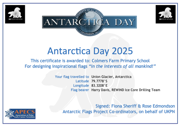Before half term, our Year 5s designed some flags for Antarctica in their art lessons. These were entered into a competition for International Antarctica Day (1st December), where the prize was for the designs to be taken to Antarctica by the REWIND ice core drilling team, who study ice cores to find out more about the history of our planet.